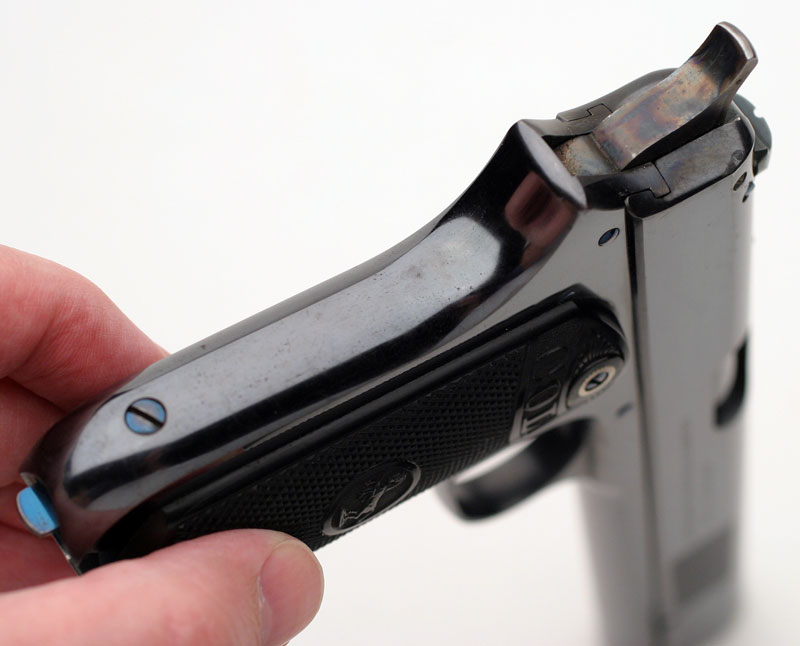 Colt Model 1900 Serial Number 4238 - grip straps retain most of the original blue.  Note the high polish fire blue on the main spring screw and the magazine release as well as the color case hardening on the hammer.
