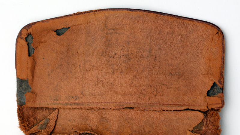 There are two names that are legible on this case. The first is Charles Michelson and the second is Lt. Col. Carroll E.B. Peeke. It appears that there was something else inscribed inside the long upper flap of the case (below), but whatever was written there is now illegible.