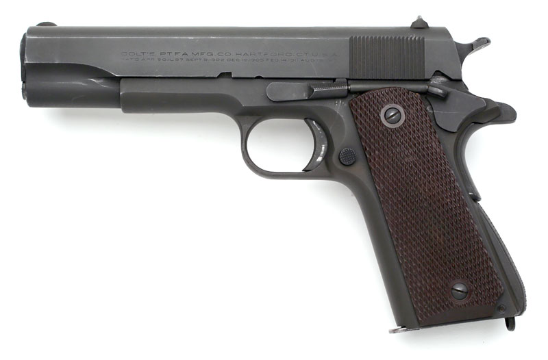 ![]() Colt Model 1911A1 .45 ACP Serial Number 865559 - One of 6,575 unsold commercial Government Model pistols transferred by Colt to their existing Military contract (No. W-478-ORD-1528). The GOVERNMENT MODEL inscription on the frame was removed and was restamped UNITED STATES PROPERTY in its place and M1911A1 U.S. ARMY in front of the pin for the takedown lever. The commercial serial numbers were removed and they were renumbered in the military serial number range beginning with number 860003. Then the guns were parkerized.