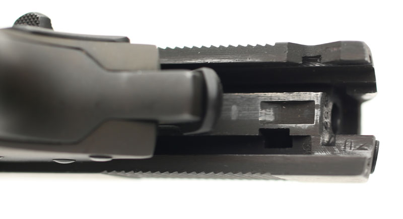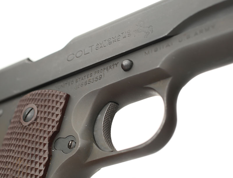 This pistol was manufactured with the Swartz Safety (which was a firing pin block safety added to Government Model pistols around 1938) but the internals have been removed upon conversion to the military contract. This pistol also has the letter S (the commercial sale mark) stamped inside the slide and frame. These pistols have commercial magazines which were also transferred to the military contract. They are full blued, with riveted bases and are marked COLT over .45 AUTO. The bottoms of these commercial magazines have been sandblasted to make them non-reflective. There is a P proof on the top of the slide, in front of the rear sight and alto a P on the left side of the frame near the magazine release button. The barrel in this gun is a commercial barrel marked COLT .45 AUTO on the left side, with the commercial sale mark S in front of the barrel lug on the underside of the chamber. There is no P on the left lug. Gun has Type 2 Coltwood plastic grips with strengthening ribs, mold numbers and large reinforcing rings around screw holes.