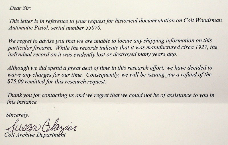 Colt Woodsman Target Pistol .22 LR Serial Number 55070 - An early Model S "Woodsman" in very nice condition. This pistol belonged to firearms inventor Charles J. Jolidon as it was obtained by the previous owner directly from Charles J. Jolidon's son, Charles F. Jolidon. Charles J. Jolidon was a designer of guns and gun improvements and held many patents in his name that were used by Colt and other firearms manufacturers. This Woodsman was accompanied by two original US Patents issued to Charles J. Jolidon: U.S. Patent 1310397 and U.S. Patent 1382197 (pictured with the Colt above and separately below.) Charles F. Jolidon told the previous owner that Colt gave him this gun, along with custom Colt grips made to his hand. Accompanying the gun is a letter from the Colt Historian indicating that they were able to find any shipping information on this gun (which is consistent with there being no VP (Colt's Verified Proof Mark) on the upper left flat of the trigger guard.