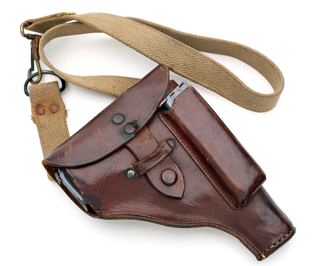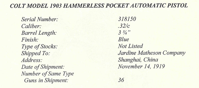 Colt 1903 Pocket Hammerless .32 ACP serial number 318150 - One of 36 pistols shipped to Jardine Matheson Company, Shanghai, China on November 14, 1919. Pistol has a blue finish and Colt hard rubber stocks. Accompanying this pistol is brown leather British flap holster that's been converted from a hip holster to a shoulder holster.
