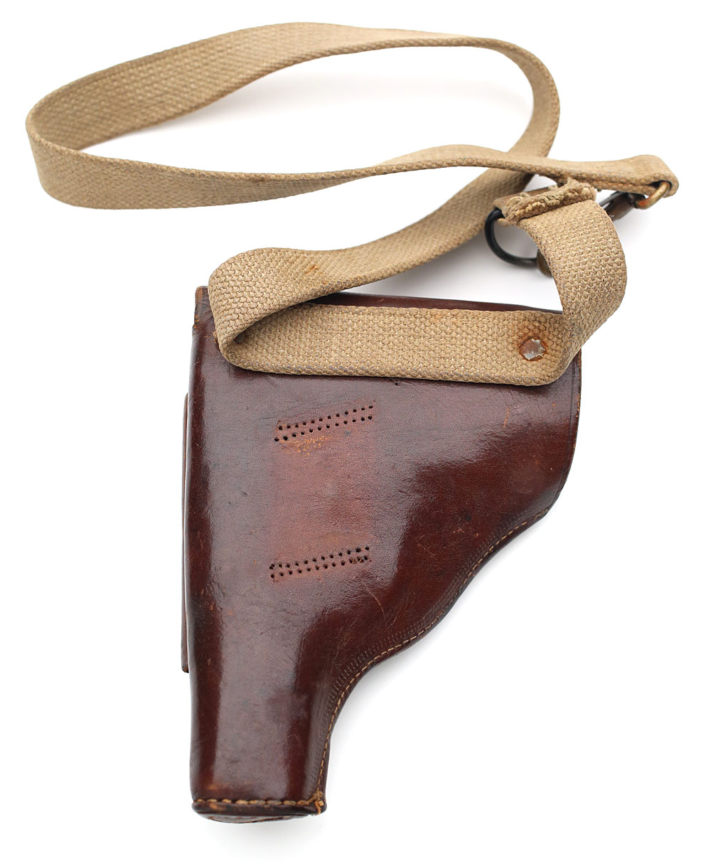 Colt 1903 Pocket Hammerless .32 ACP serial number 318150 - rear view of shoulder holster showing where belt loop was removed and olive drab canvas strap was added. |