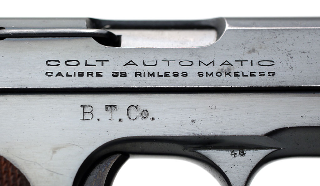 Colt 1903 Pocket Hammerless .32 ACP sn 476915 - Right side close-up of "B.T.Co." marking on frame.