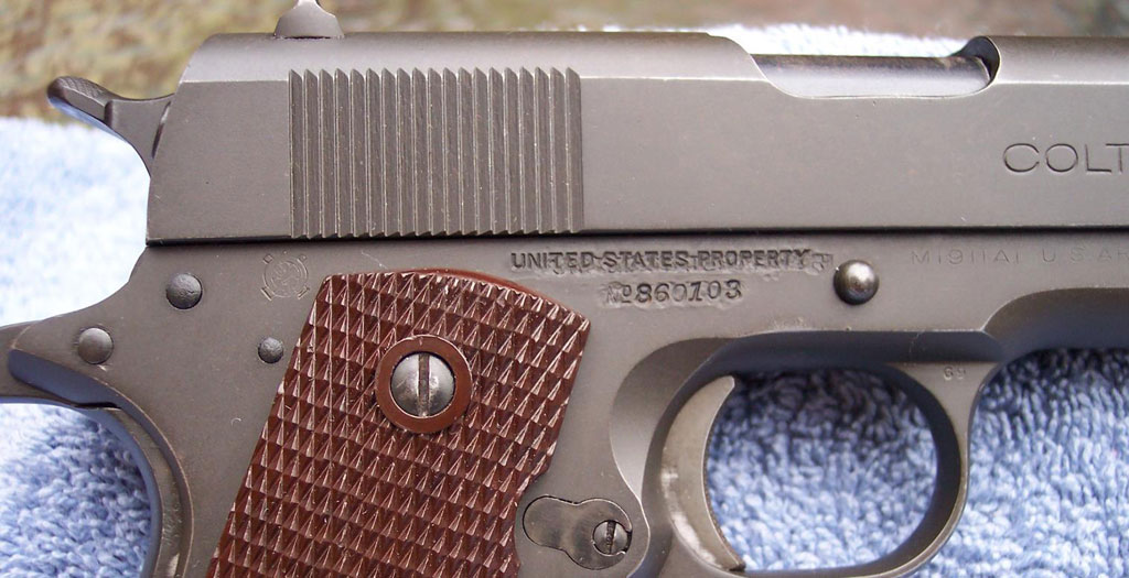 Colt Model 1911A1 .45 ACP Serial Number 860103 - ordnance wheel located behind the right grip. Visible are the rough machining marks which removed the "GOVERNMENT MODEL" and commercial serial number prior to renumbering the gun in the military serial number range.