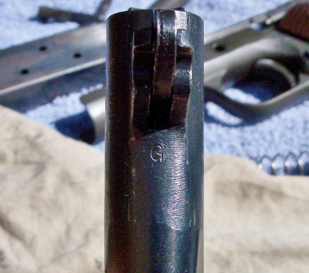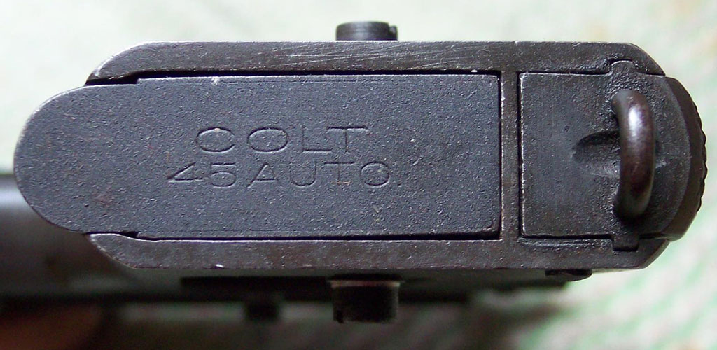 This pistol was manufactured with the Swartz Safety (which was a firing pin block safety added to Government Model pistols around 1938) but the internals have been removed upon conversion to the military contract. This pistol also has the letter S (the commercial sale mark) stamped inside the slide and frame. There is a P proof on the top of the slide, in front of the rear sight and alto a P on the left side of the frame near the magazine release button. The barrel in this gun is a commercial barrel marked COLT .45 AUTO on the left side, with the commercial sale mark S in front of the barrel lug on the underside of the chamber. There is no P on the left lug.