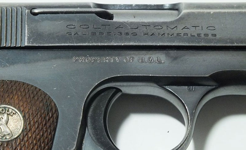 Colt 1908 Pocket Hammerless .380 ACP sn 102822 - right side close-up of PROPERTY OF U.A.L. inscription.