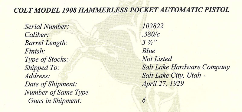 Tom Glaser Collection Colt 1903 Pocket Hammerless .380 ACP sn 102822 - a standard production Colt Pocket Hammerless .380 ACP with PROPERTY OF U.A.L. inscription added to the right side of the frame. The factory letter for this pistols indicates that it was one of 6 shipped to Salt Lake Hardware Company, Salt Lake City, Utah on April 27, 1929, presumably where it was purchased by United Air Lines and property marked for their use.