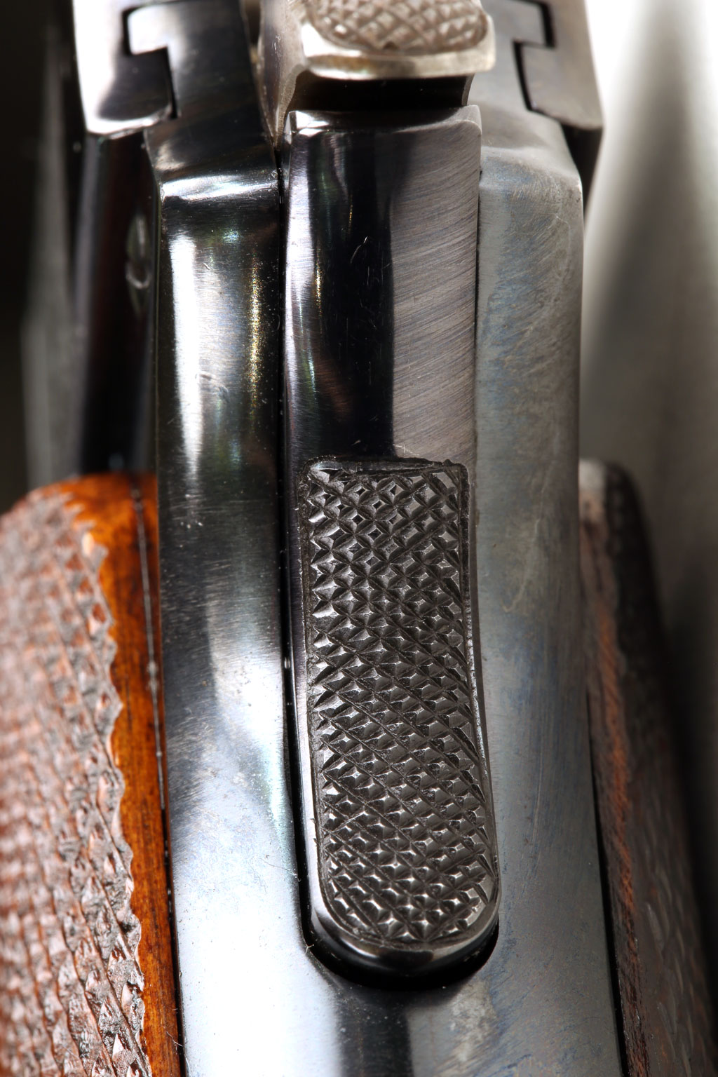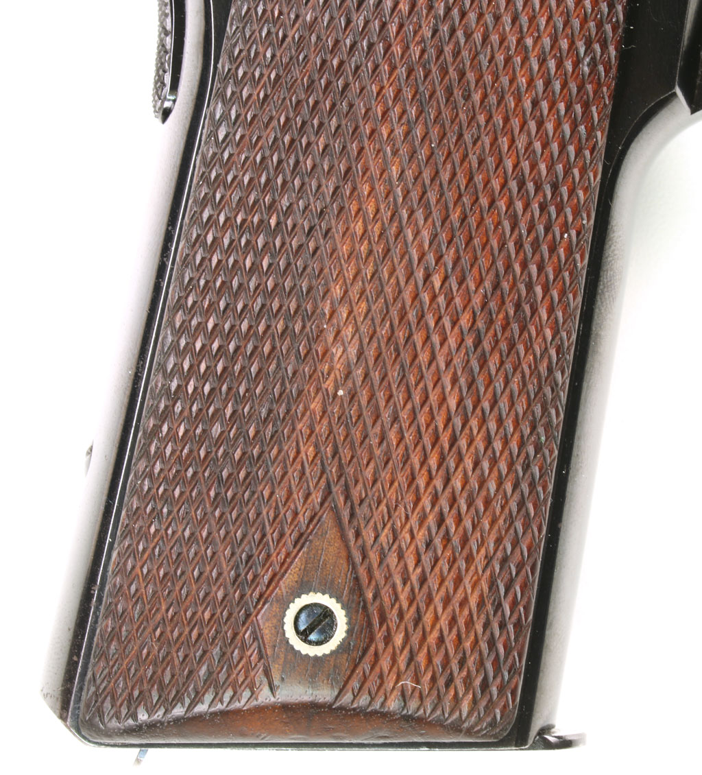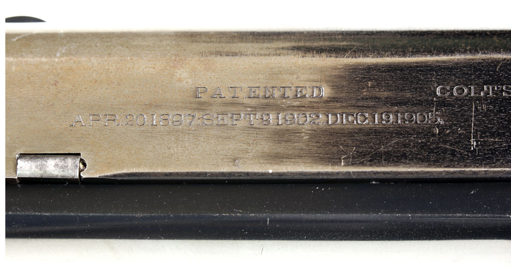 Rob Greer Collection Model 1907 Military Serial Number 19 - 200 .45 cal. No. 1 -200 (inclusive) Modified hammer, Nearly vertical ejection. Auto Indicator to show that chamber is loaded, Auto safety, Strengthened stirrup, and Lengthened trigger stirrup pin. Shipped to the U.S. Government, Springfield Armory, March 17, 1908