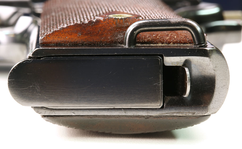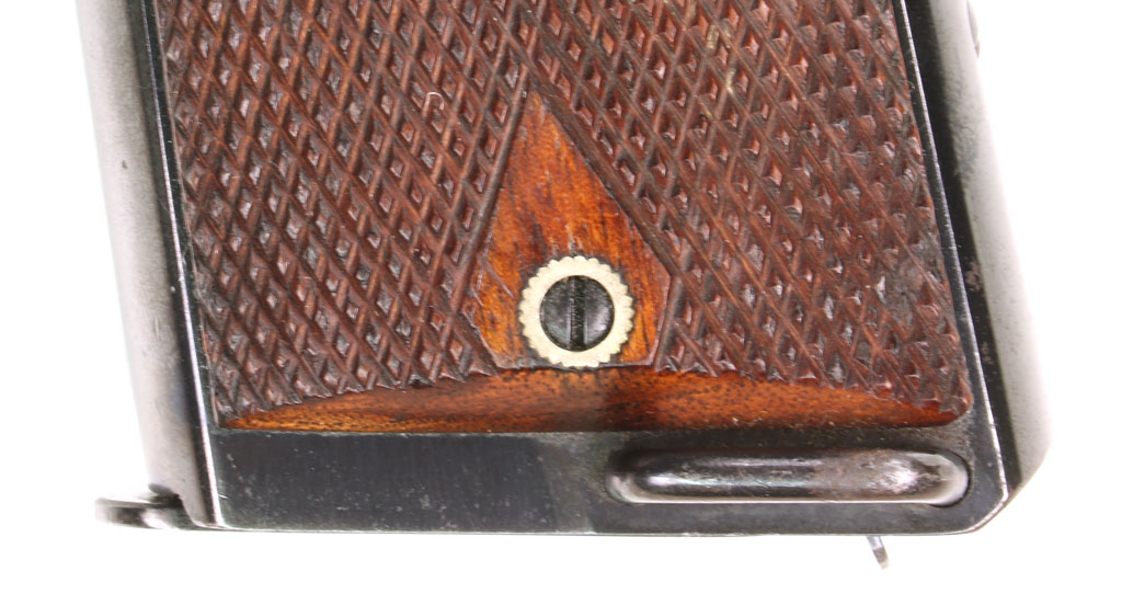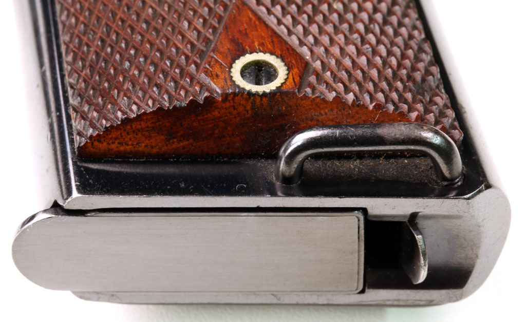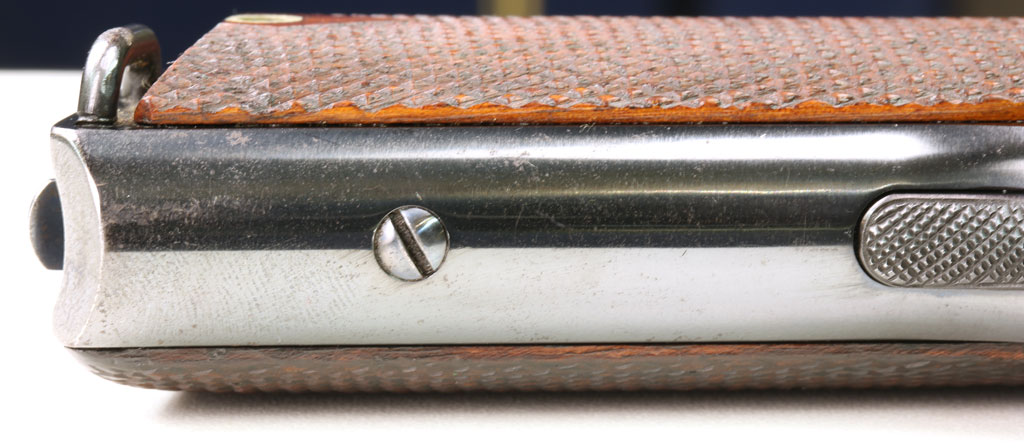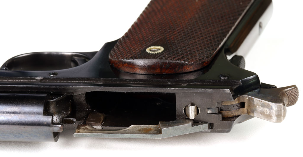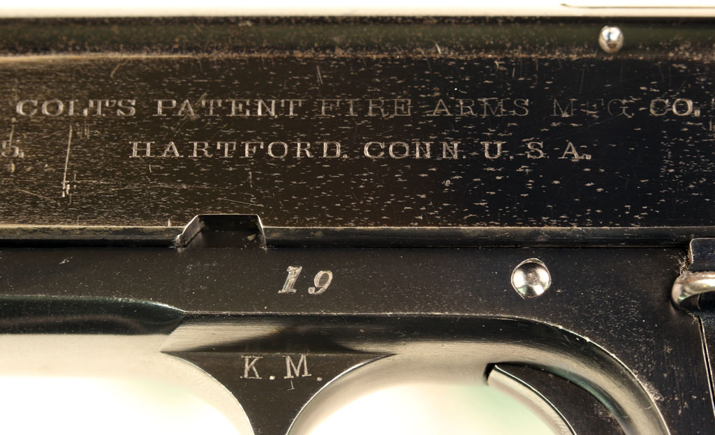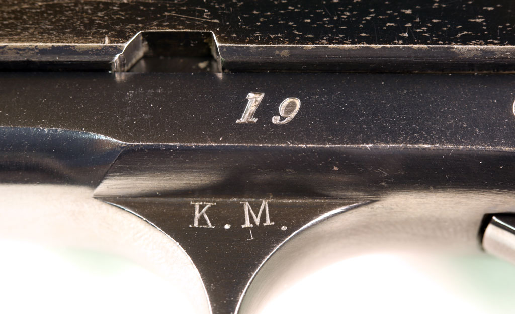 Left side of Model 1907 sn 19. Note the grip safety and lanyard loop. A single officer presided over the inspection of the Model 1907 Contract pistols. All of the pistols bear the initials "K.M." for Major Kenneth Morton. These initials are hand stamped into the upper leg of the trigger guard on the left side. Major Morton assumed the post in April 1907 and acted as the inspecting and accepting officer throughout the fiscal year 1907 - 1908.