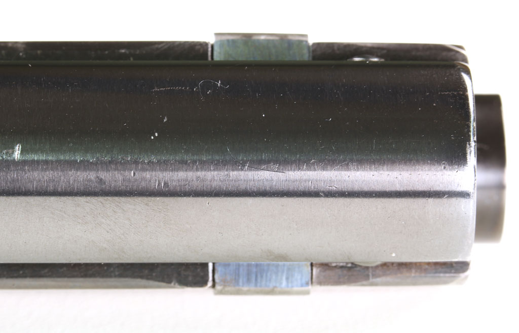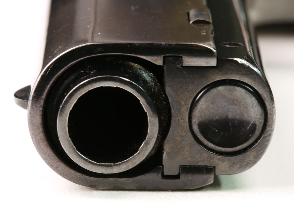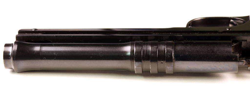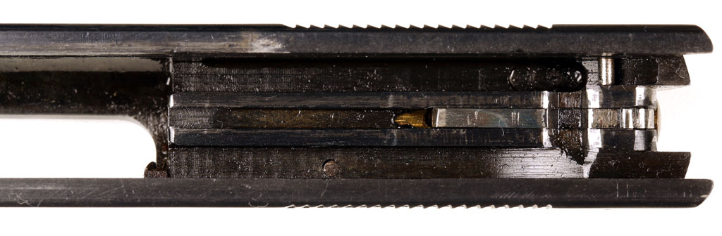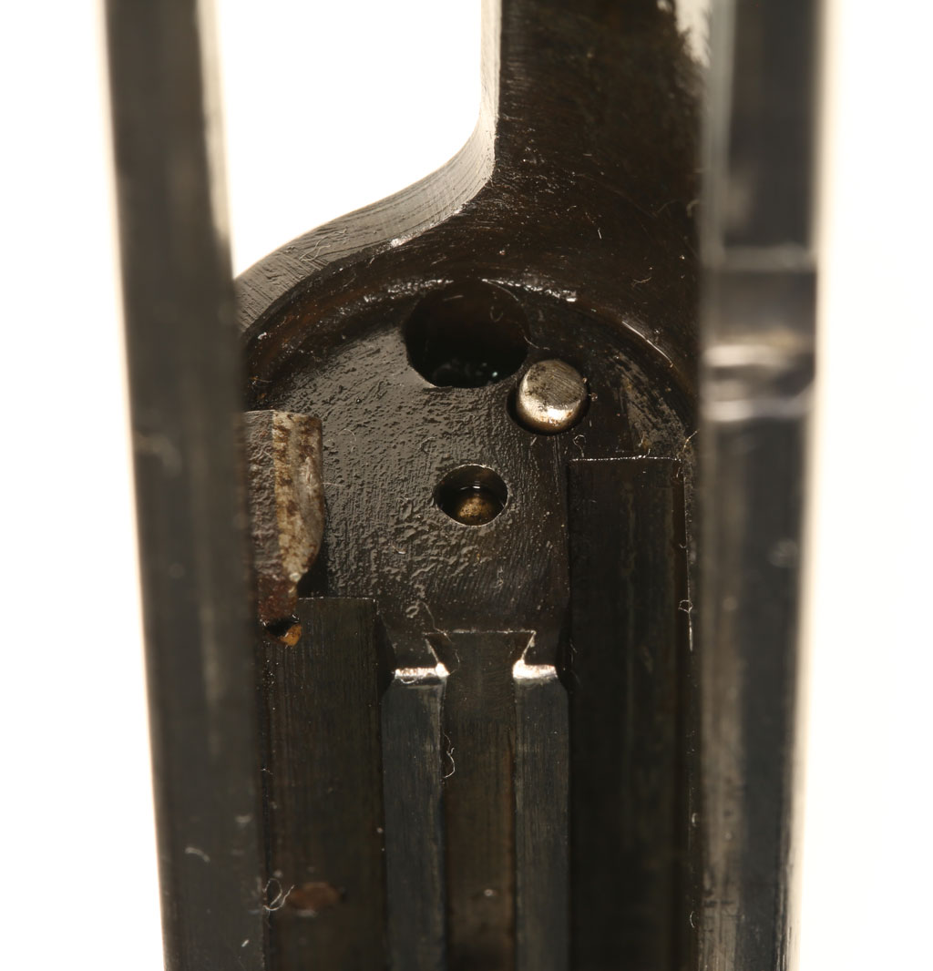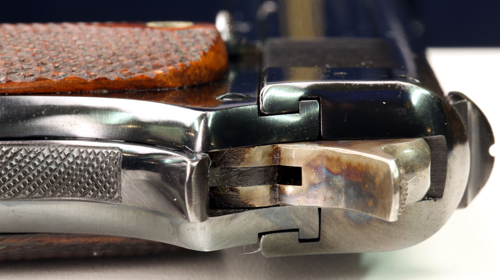 Left side of Model 1907 sn 19. Note the grip safety and lanyard loop. A single officer presided over the inspection of the Model 1907 Contract pistols. All of the pistols bear the initials "K.M." for Major Kenneth Morton. These initials are hand stamped into the upper leg of the trigger guard on the left side. Major Morton assumed the post in April 1907 and acted as the inspecting and accepting officer throughout the fiscal year 1907 - 1908.