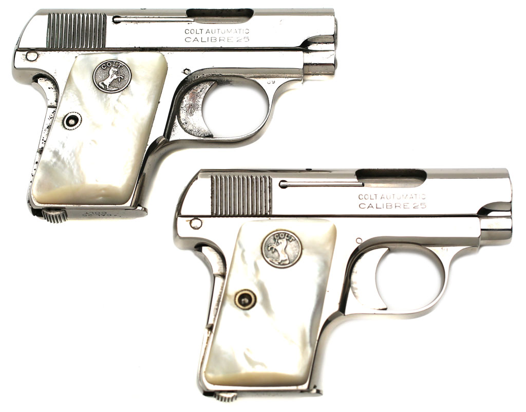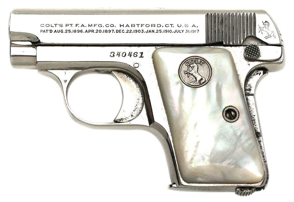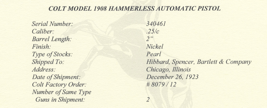 Colt 1908 Vest Pocket .25 ACP serial number 340461 - Pistol has old nickel plated refinish and factory mother of pearl stocks with early flush forward facing Colt medallions. The forward facing flush medallions were only used for a few months during production. Colt later made the decision to use the same flush medallion in both stocks, presumably to save money. Pistol letters nickel with mother of pearl stocks and was shipped to Hibbard, Spencer, Bartlett & Company on December 26, 1923 in a 2 gun shipment. Work was processed on Colt factory order #8079/12.