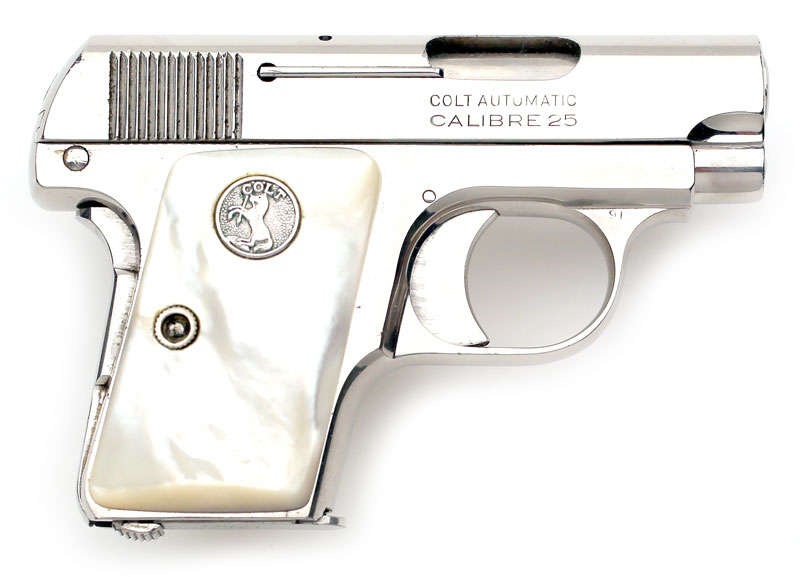 Colt 1908 Vest Pocket .25 ACP serial number 371124 - Pistol is factory nickel plated with mother of pearl stocks with slightly later flush medallions. Note how the flush medallion in the right stock faces the rear of the pistol. This pistol is the August 2015 Gun of the Month. |