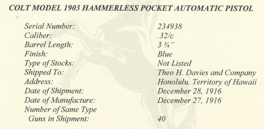 Colt Model 1903 Pocket Hammerless .32 ACP serial number 234938 - Colt Historical Factory Letter indicates this pistol was manufactured on December 27, 1916 and was one of 40 shipped on December 28, 1916 to Theo H. Davies and Company, Honolulu, Territory of Hawaii.