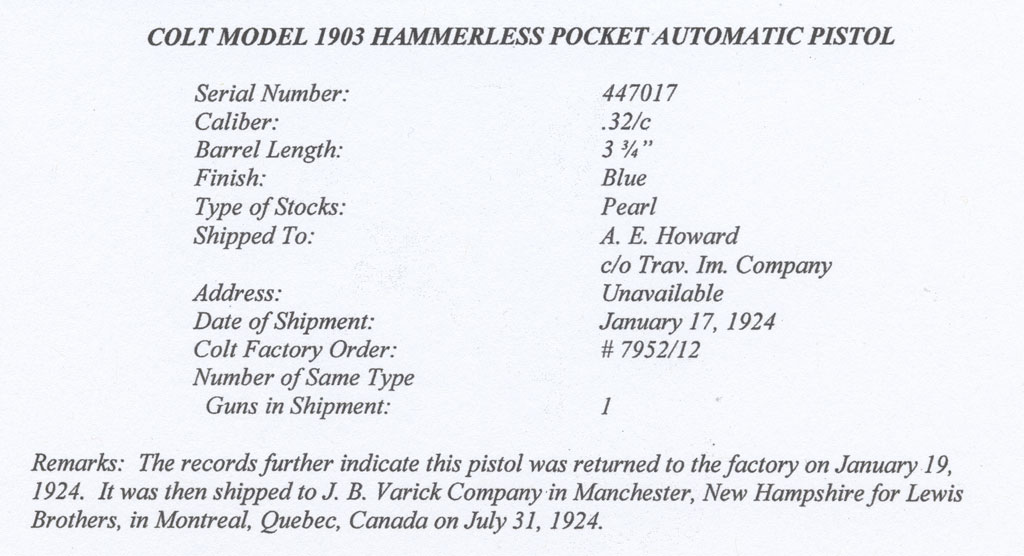 Colt Model 1903 Pocket Hammerless .32 ACP serial number 447017 - Factory letter indicates that this pistol was shipped to A.E. Howard c/o Trav. Im. Company, January 17, 1924 and processed on Colt Factory Order Number 7952/12 in a single gun shipment. The records further indicate this pistol was returned to the factory on January 19, 1924 and then shipped to J.B. Varick Company in Manchester, New Hampshire for Lewis Brothers, in Montreal, Quebec, Canada on July 31, 1924.