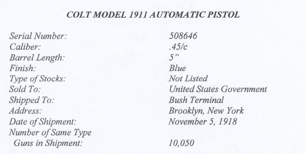 Colt Model of 1911 U.S. Army serial number 508646 - pictured with accompanying holster and canvas magazine pouch. Sold to the United States Government, Bush Terminal, Brooklyn, New York, November 5, 1918 in a shipment of 10,050 guns.