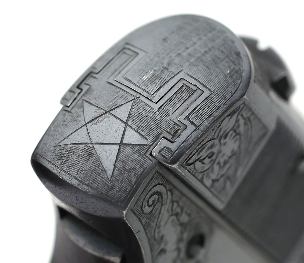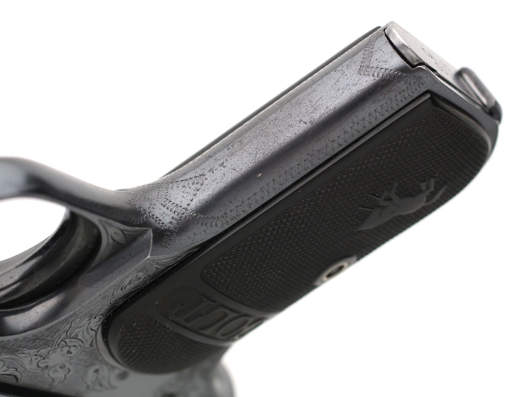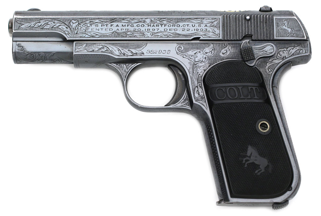 Colt Model 1903 Pocket Hammerless .32 ACP factory master engraved - serial number 382938, factory master engraved by William H. Gough, distinctive five pointed star engraved on rear of frame. This star appears on other known examples of Gough's work.