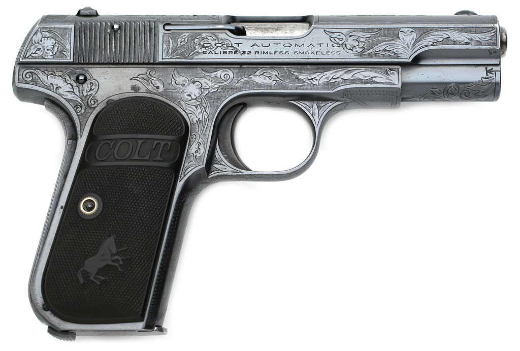 Colt Model 1903 Pocket Hammerless .32 ACP factory master engraved - (right side) serial number 382938, factory master engraved and gold inlaid "EJM" on the top of the slide by William H. Gough with factory black hard rubber stocks, blued finish. Engraved with Gough's distinctive floral and vine design of engraving and fine lined background.