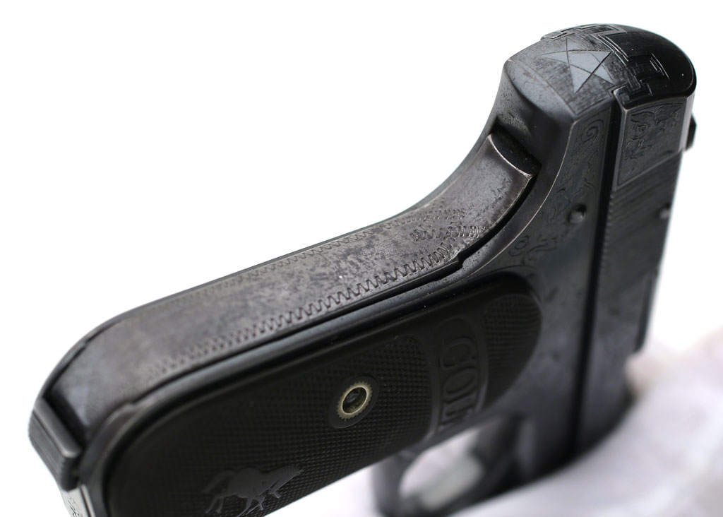 Colt Model 1903 Pocket Hammerless .32 ACP factory master engraved - serial number 382938, factory master engraved by William H. Gough. Close-up of front grip strap. |