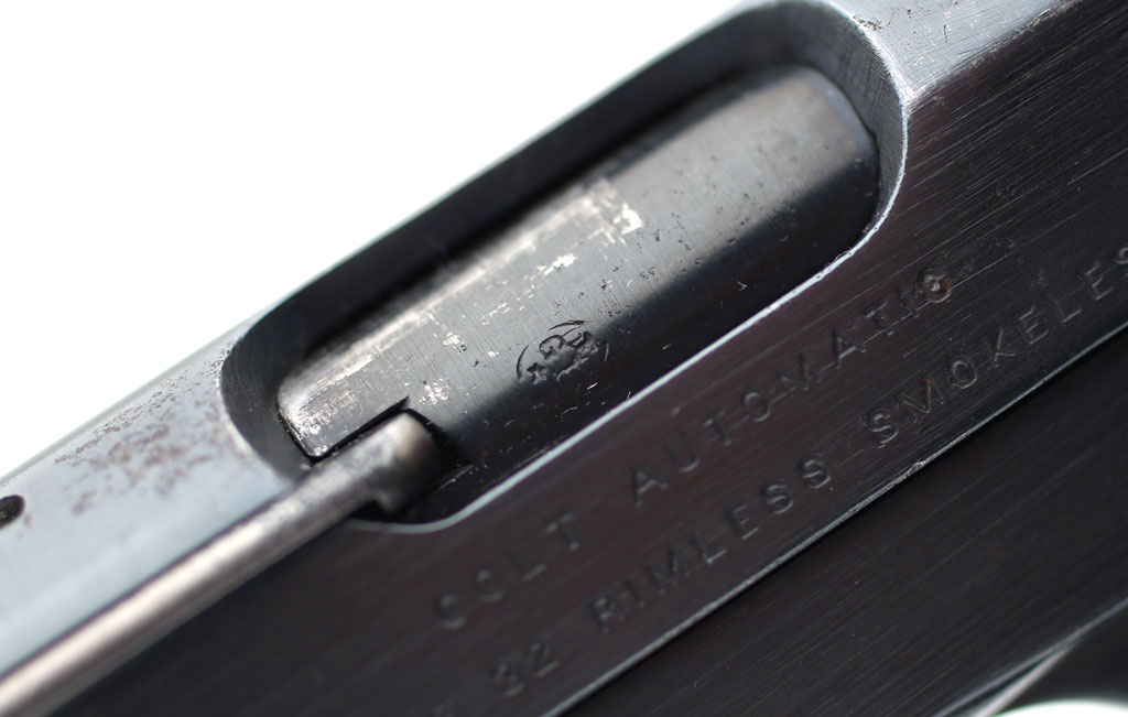 Colt Model 1903 Pocket Hammerless .32 ACP serial number 226496 - close-up of the Liege proof on the barrel visible through the ejection port.