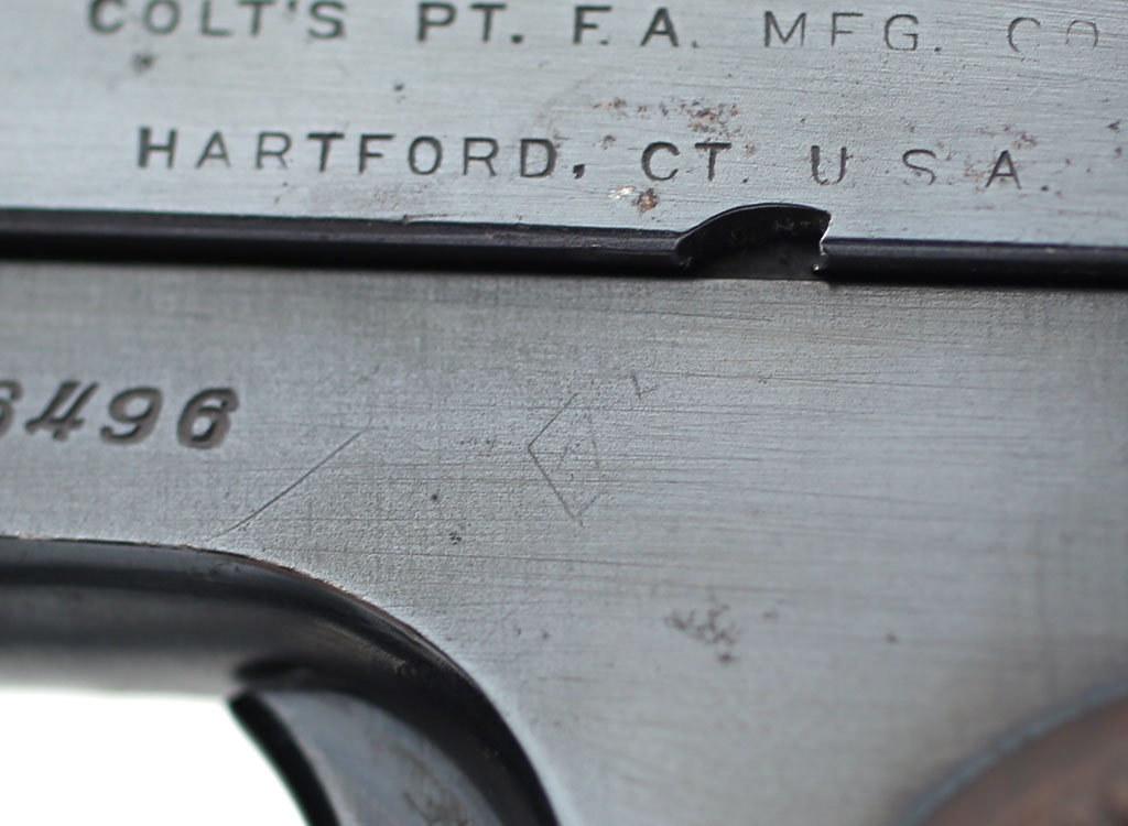 Colt Model 1903 Pocket Hammerless .32 ACP serial number 226496 - close-up of the Diamond "A" proof that was applied to most of the guns in this contract. |