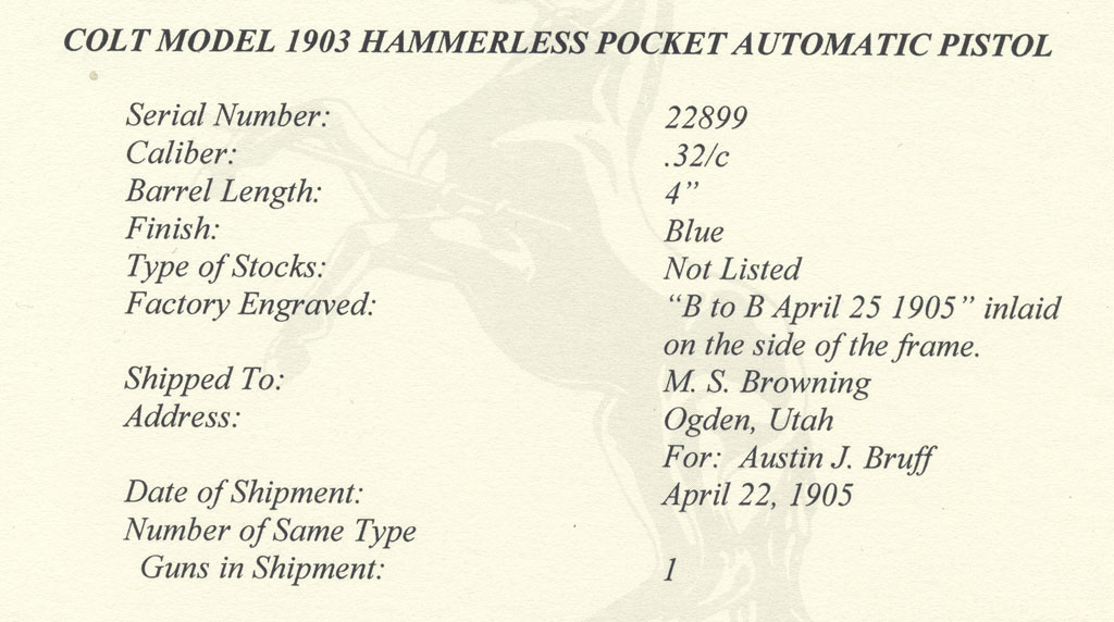 Colt Model 1903 Pocket Hammerless serial number 22899 -Colt factory letter indicates that Colt 1903 serial number 22899, .32/c, 4" barrel was factory engraved "B to B April 25, 1905" inlaid on the side of the frame. Shipped to M.S. Browning, Ogden, Utah For: Austin J. Bruff, Shipped April 22, 1905 in a 1 gun shipment.