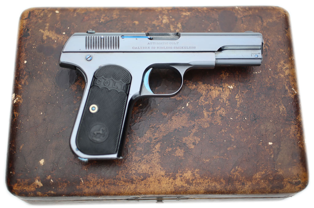 Colt Model 1903 Pocket Hammerless serial number 22899 - right side pictured on top of deluxe leather factory case.
