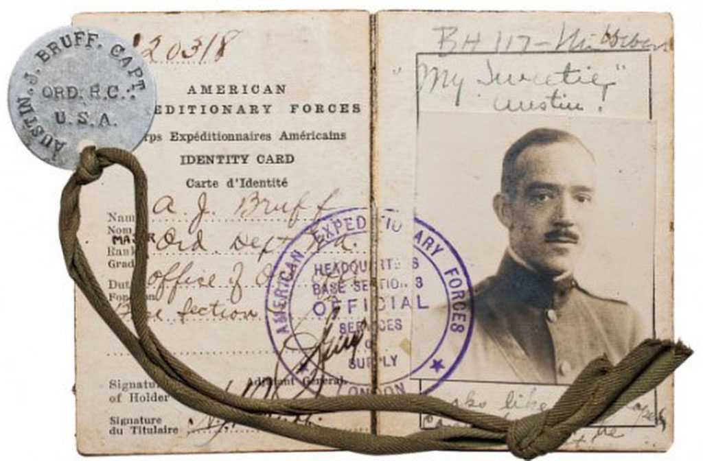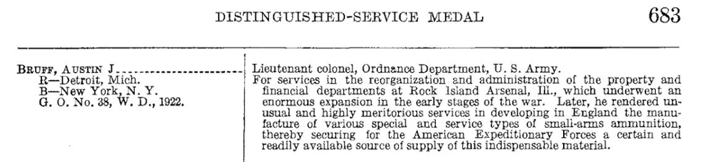 Young Austin attended the best schools, graduating from Phillips Andover Academy at Andover, Massachusetts in 1899 and from Yale University in 1902. Following his graduation, he accepted a position for a short time as a clerk at Colt’s Patent Fire Arms Manufacturing Company in Hartford, Connecticut. In 1904, he moved to Bridgeport and accepted a position as a clerk at the Union Metallic Cartridge Company. Following the entry of the US into WWI, Bruff answered his nation’s call and enlisted in the U.S. Army where he attained the rank of Colonel serving in France as an Aid to General John J. Pershing.