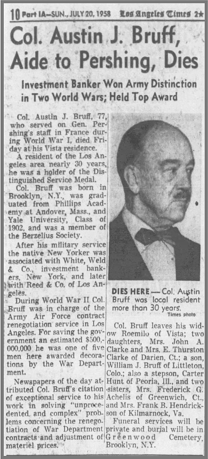 Col. Bruff leaves his widow Roemilo of Vista; two daughters, Mrs. John A. Clarke and Mrs. E. Thurston Clarke of Darien, Ct.; a son, William J. Bruff of Littleton, Colo.; also a stepson, Carter Hunt of Peoria, Ill., and two sisters, Mrs. Frederick G. Achelis of Greenwich, Ct., and Mrs. Frank B. Hendrickson of Kilmarnock, Va.