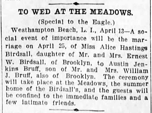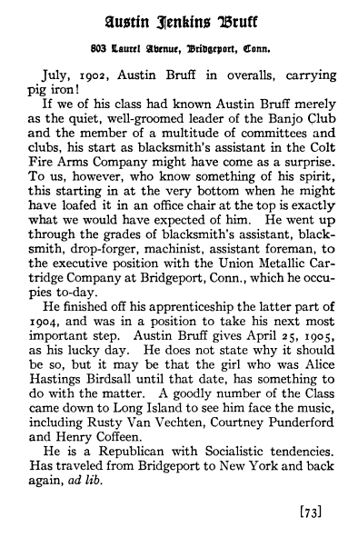 Austin Jenkins Bruff was born on July 29, 1881 in Brooklyn, New York, the second son of Mr. & Mrs. William Jenkins Bruff. William J. Bruff was the president of the Union Metallic Cartridge Company in Bridgeport, Connecticut starting in 1902.