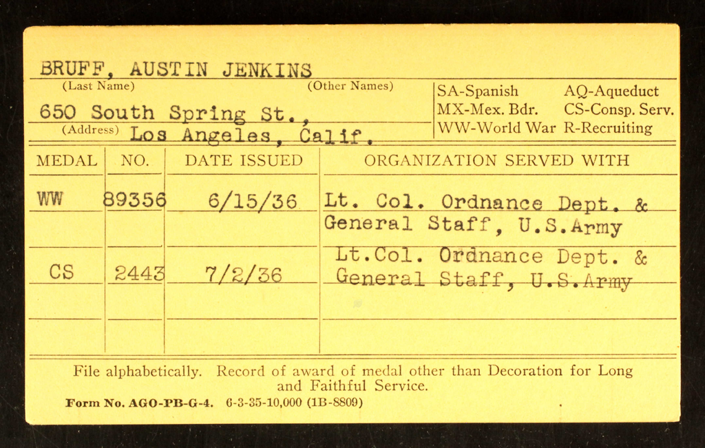 During WWII, Colonel Bruff was reactivated and put in charge of the Army Air Force Contract Renegotiation Service in Los Angeles, California where he received a citation by the War Department for that work.