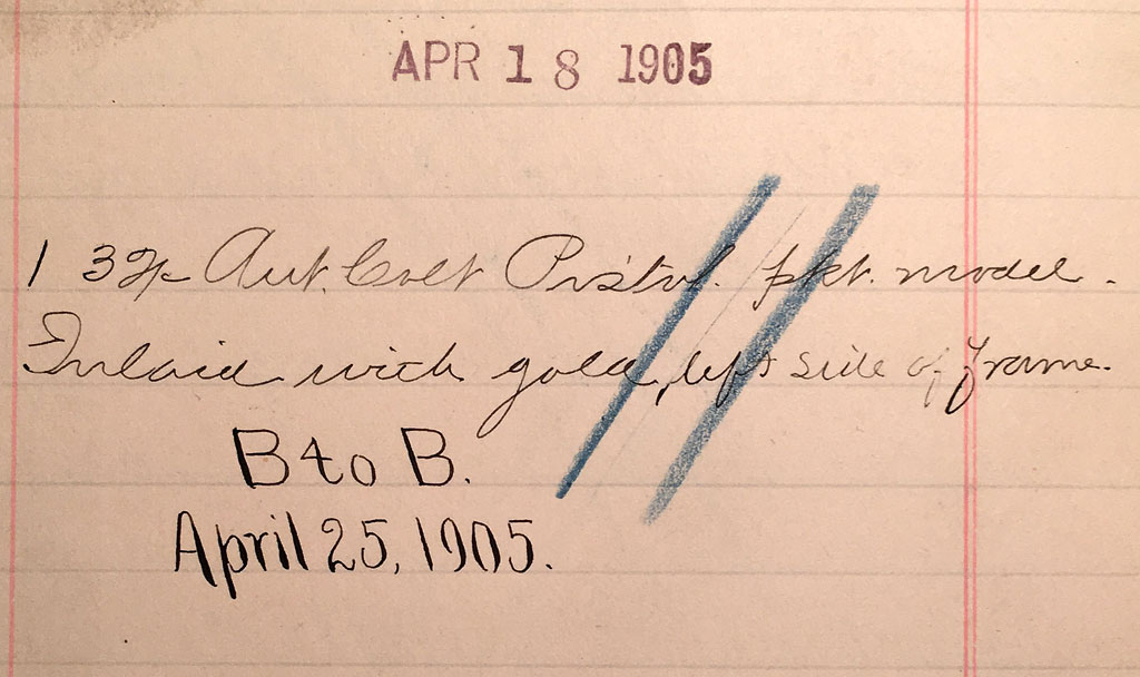 This pistol is a Colt factory special order piece with an extremely rare deluxe factory casing. The order for this Colt is listed in the Colt Special Order Ledger with a description of the special gold inlay and the order date of April 18, 1905. The Colt Historical Letter confirms shipment to Matthew S. Browning on April 22, 1905. The significance of this special gift cannot be underestimated given the close relationship John M. Browning and Matthew S. Browning enjoyed with the Union Metallic Cartridge Company specifically related to UMC’s development of the cartridges that all of Browning’s semi-automatic inventions relied upon.