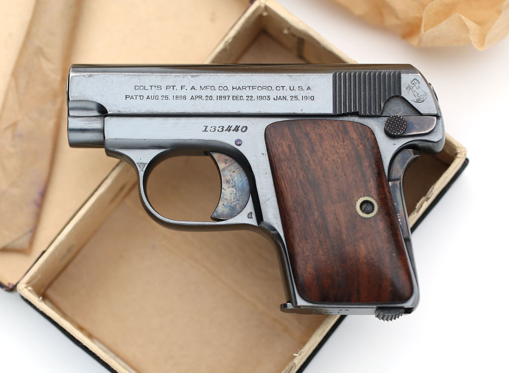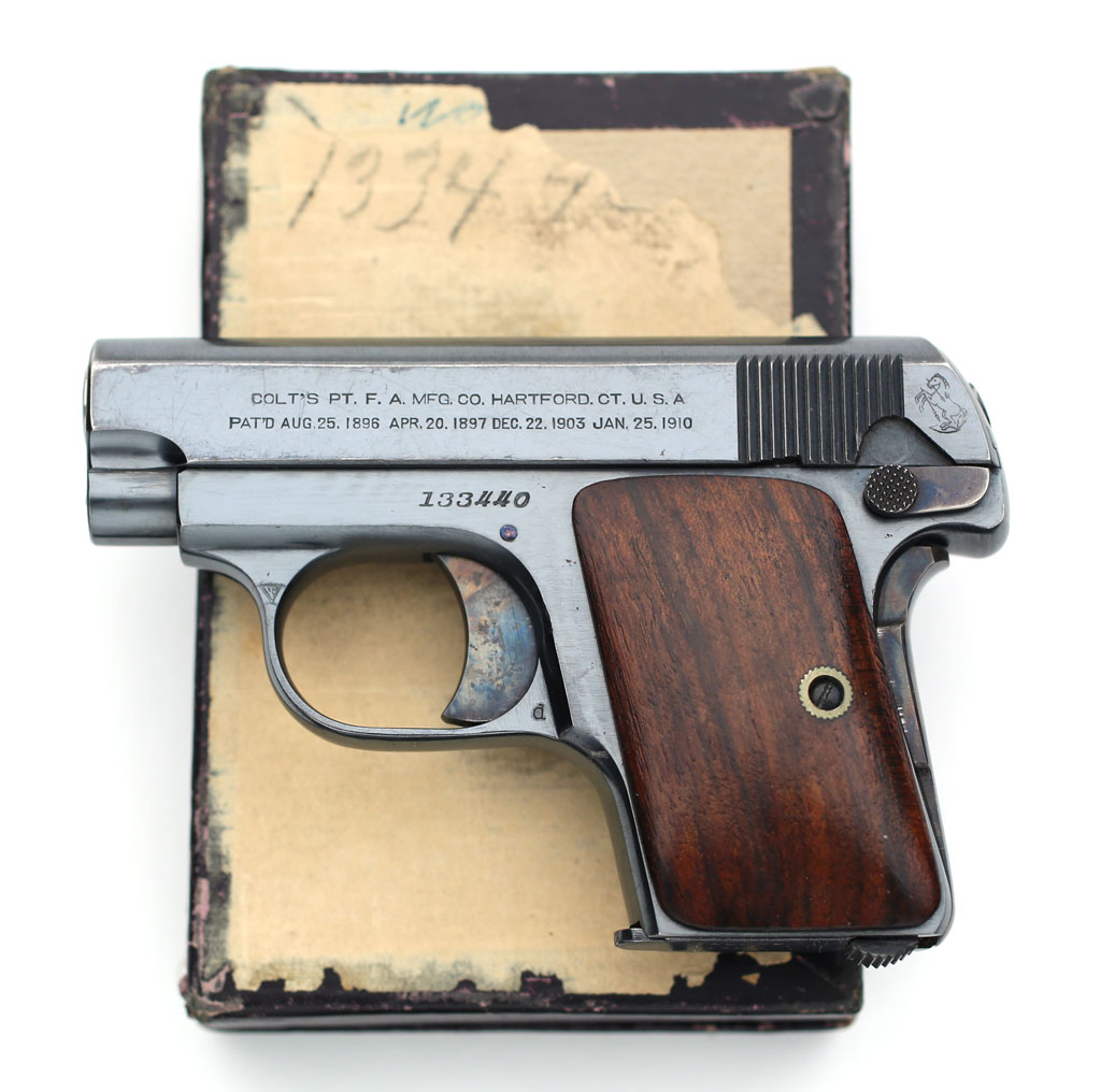 Colt 1908 Vest Pocket .25 ACP serial number 133440 - left side pictured on original box numbered to the gun.