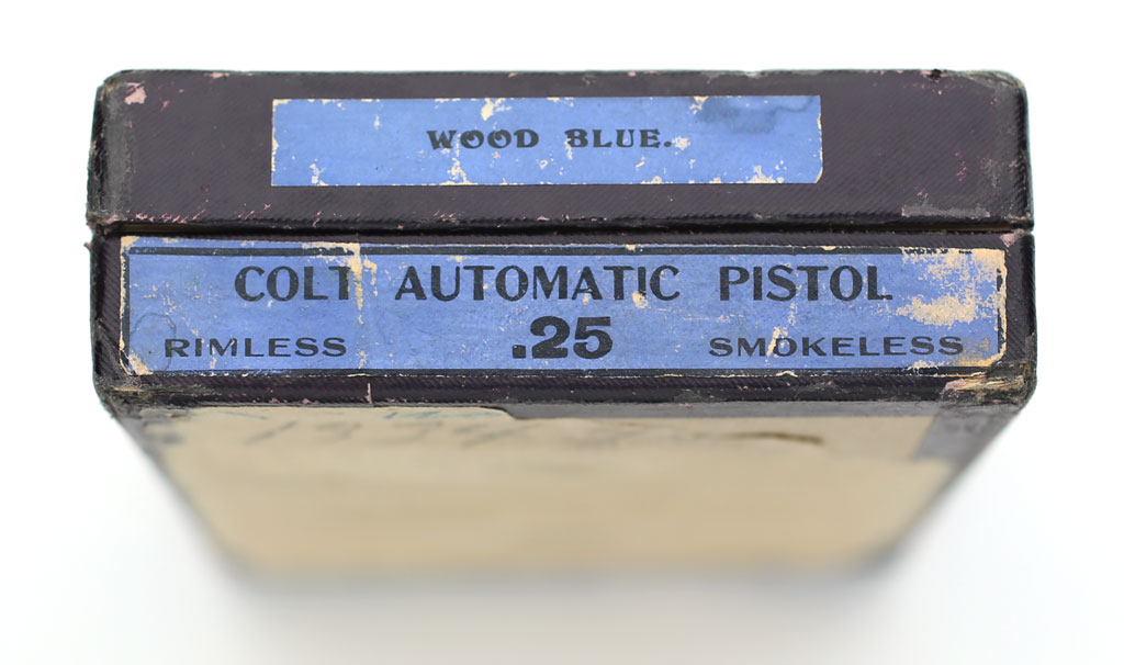 Colt 1908 Vest Pocket .25 ACP serial number 133440 - Original box with "WOOD BLUE." end label.