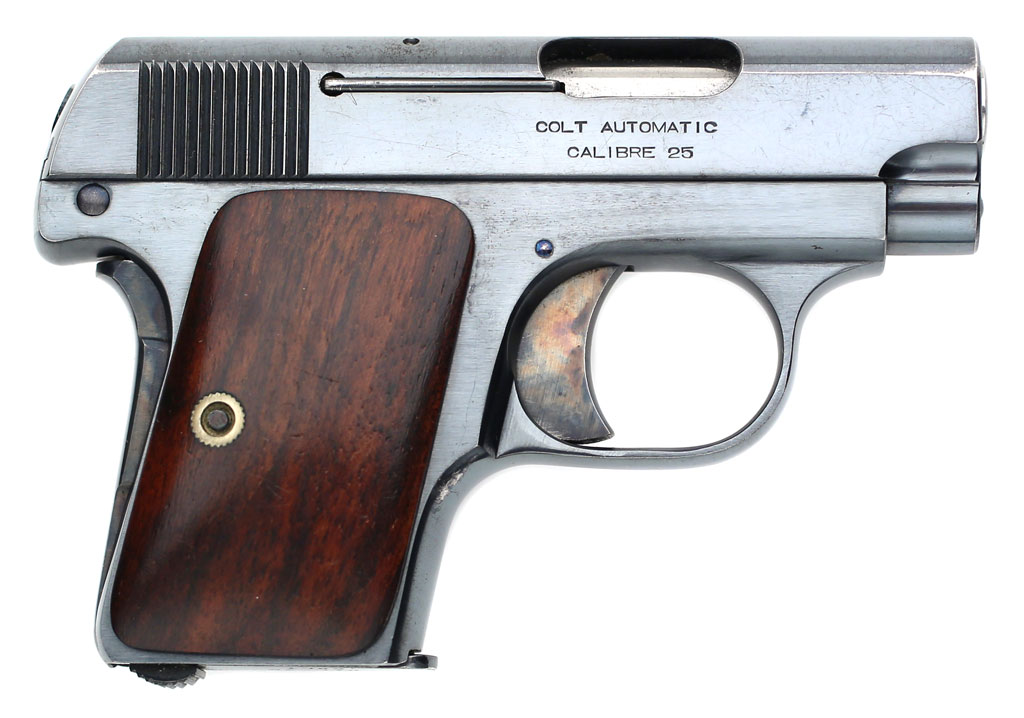 Colt 1908 Vest Pocket .25 ACP serial number 133440 - Pistol has original factory blue finish, factory smooth walnut stocks and is with original numbered box. This pistol was manufactured in 1915 and sent to Abercrombie & Fitch in New York City on December 16, 1915.
