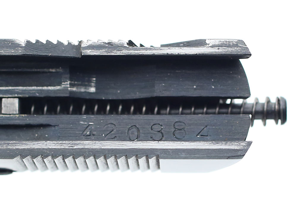 Colt 1908 Vest Pocket .25 ACP serial number 420384 - Top of the original tank blued slide. |