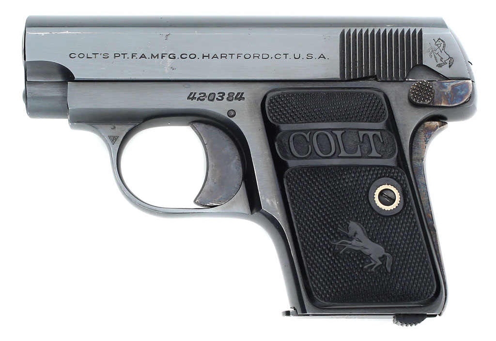 Colt 1908 Vest Pocket .25 ACP serial number 420384 - Many Pre/Post-War examples are accompanied by very noticeable, vivid case colors on the grip safety, thumb safety and trigger.