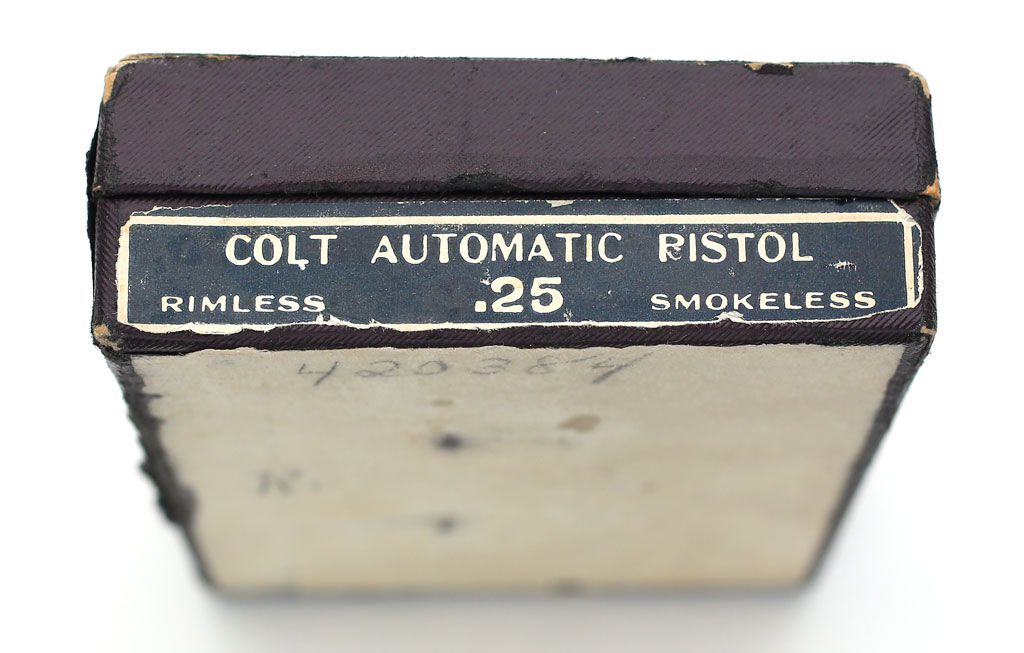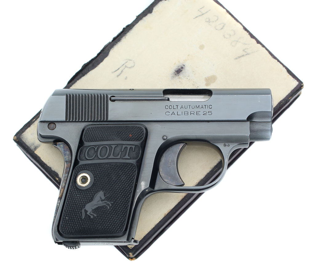 Colt 1908 Vest Pocket .25 ACP serial number 420384 - Pistol pictured on original matching numbered box with "R." also written on the bottom to designate the type of stocks for the pistol. Pre/Post-War examples with checkered walnut stocks are marked with a "W." on the bottom.