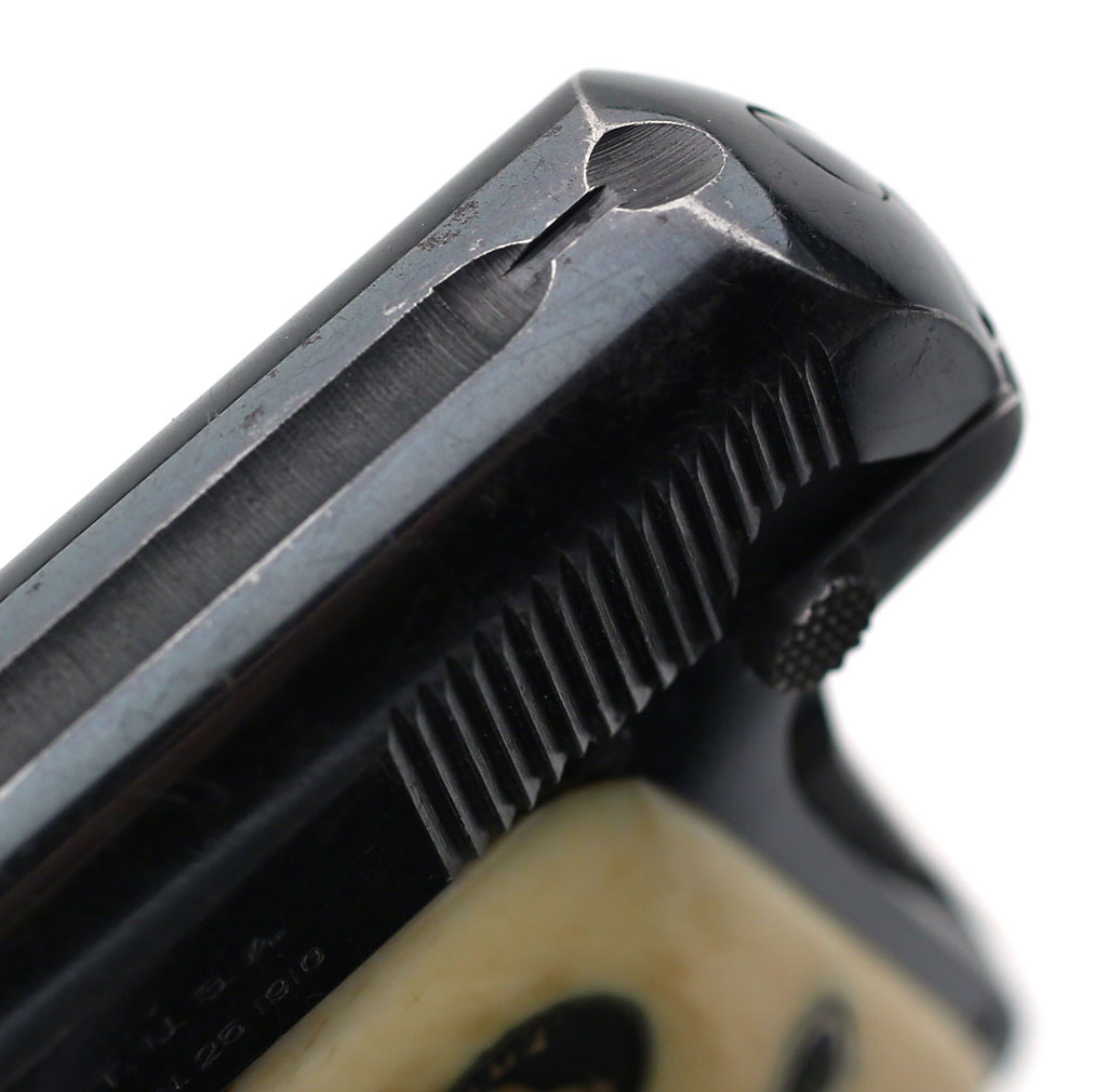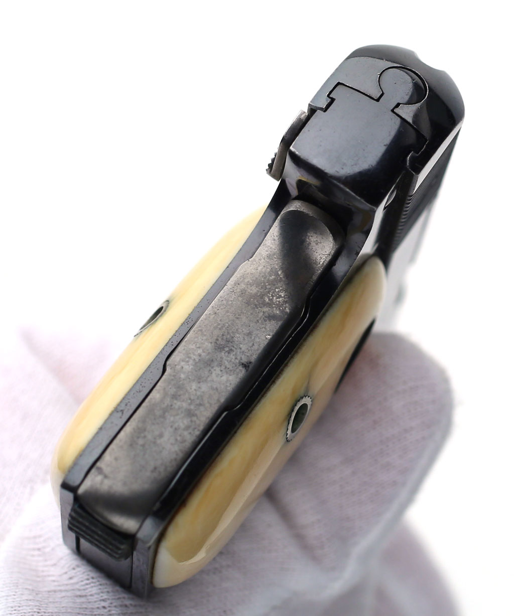 Colt 1908 Vest Pocket .25 ACP serial number 85778 - Pistol is high polished blue and is fitted with original factory recessed medallion round-top ivory stocks. This pistol was shipped from the factory with blue finish and factory ivory stocks on February 18, 1913.