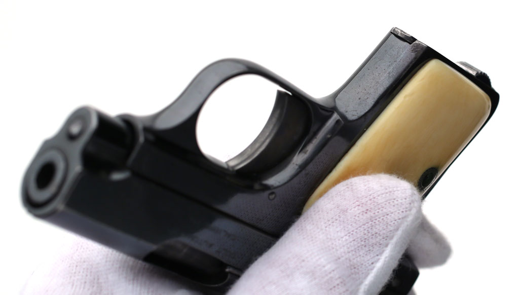 Colt 1908 Vest Pocket .25 ACP serial number 85778 - Pistol is high polished blue and is fitted with original factory recessed medallion round-top ivory stocks. This pistol was shipped from the factory with blue finish and factory ivory stocks on February 18, 1913 to Tisdall's Ltd. in Vancouver, British Columbia, Canada in a two gun shipment.