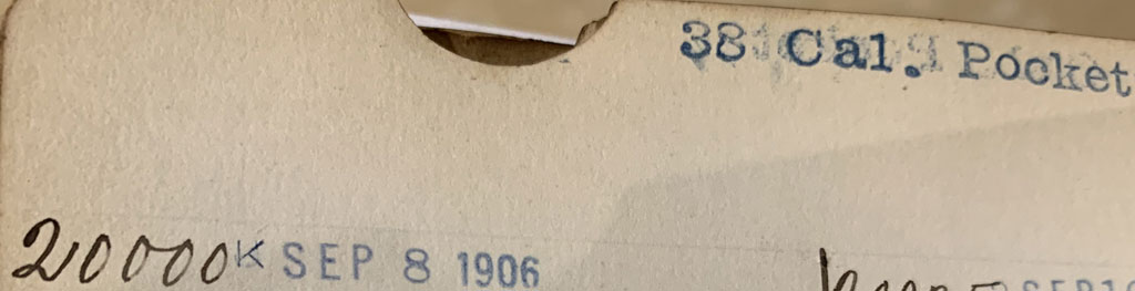 Model 1903 Pocket Hammer serial number 20000 - Original production record indicating that serial number 20000 was manufactured on September 8, 1906.