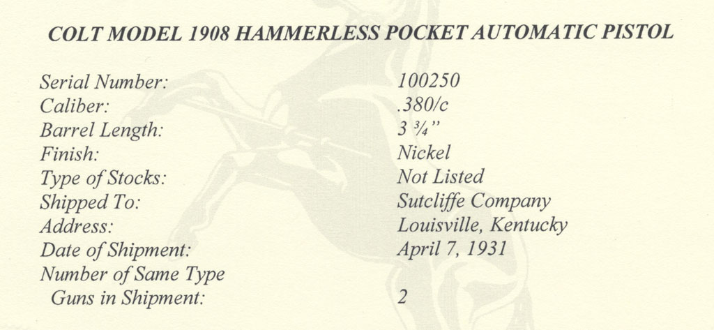 Colt Pocket Hammerless 1908 .380 ACP serial number 100250 (ca. 1928) Factory Nickel Finish and Factory Ivory Stocks with Forward Facing Flush Medallions -factory letter confirms the nickel finish, stocks not listed and indicates this pistol was one of two, shipped to Sutcliffe Company, Louisville, Kentucky on April 7, 1931.