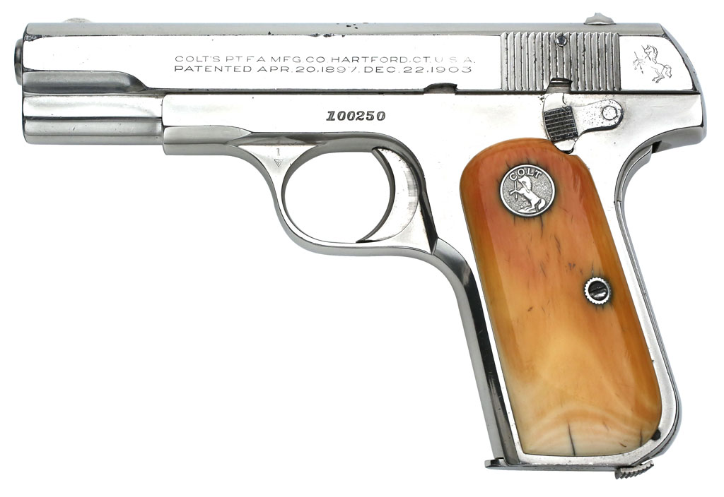 Colt Pocket Hammerless 1908 .380 ACP serial number 100250 (ca. 1931) Factory Nickel Finish and Factory Ivory Stocks with Forward Facing Flush Medallions - left side. Use of this style of medallion occurred around 1924 with the transition from recessed to flush medallions. Factory letter is pending, but I suspect these stocks were added to this pistol years ago to dress it up a bit. The pistol and ivory stocks have obviously been together for many years.