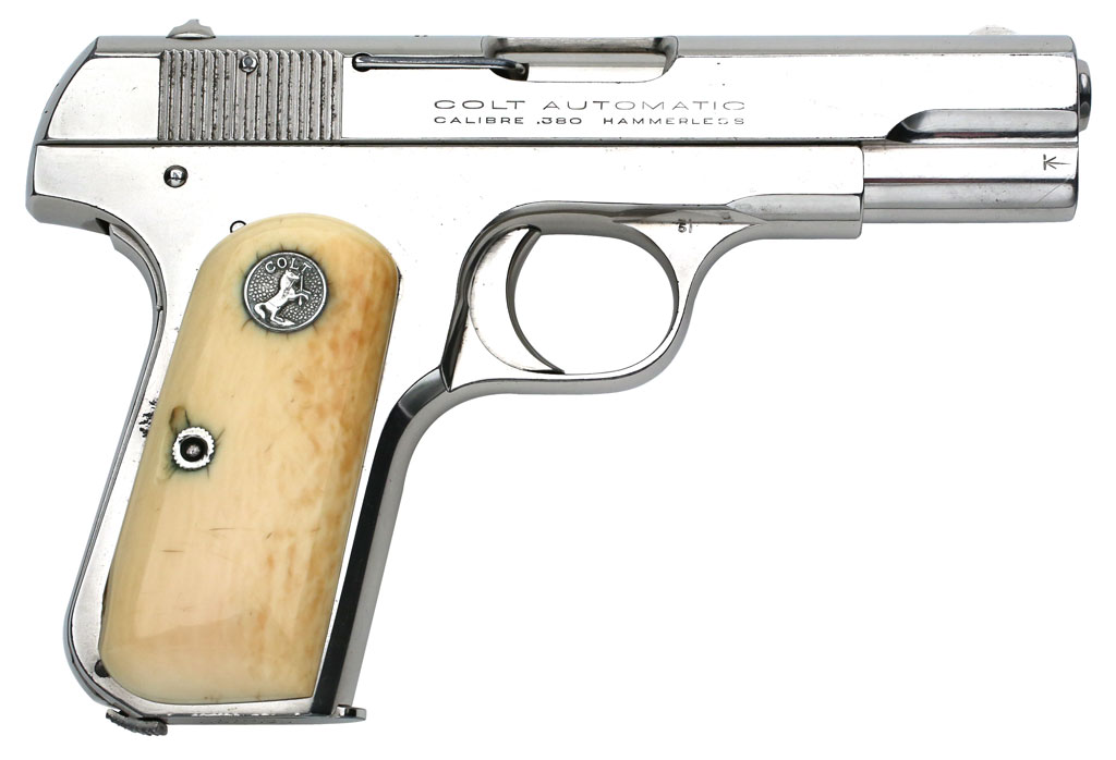 Colt Pocket Hammerless 1908 .380 ACP serial number 100250 (ca. 1928) Factory Nickel Finish and Factory Ivory Stocks with Forward Facing Flush Medallions - Right side |