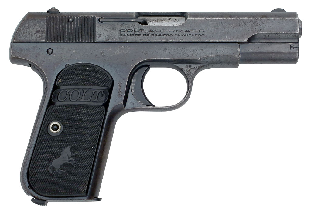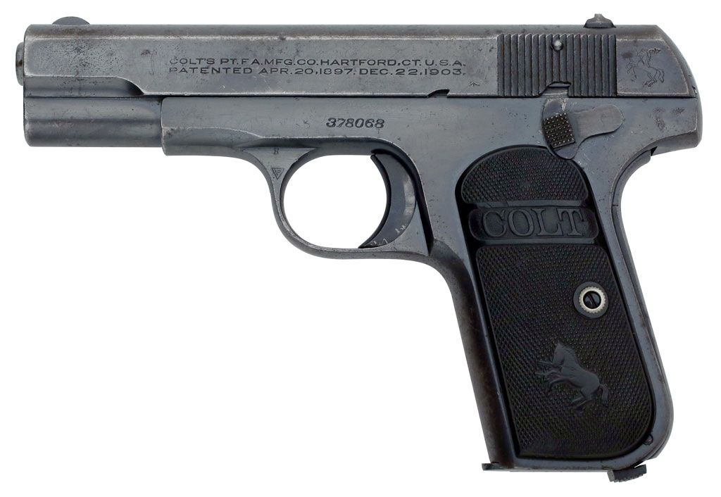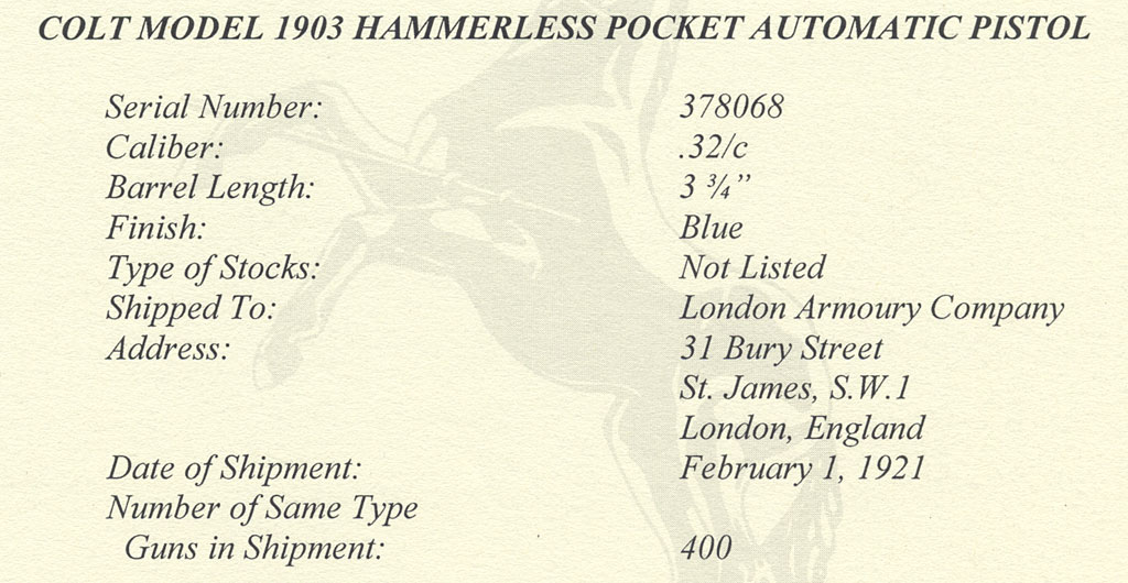 Colt Pocket Hammerless 1903 .32 ACP serial number 378068 (ca. 1921) - Pistol was one of 400 shipped to London Armoury Company, 31 Bury Street, St. James, S.W. 1, London, England, February 1, 1921. Factory blue finish with Type IV hard rubber stocks. Note British Broad Arrow marking on the slide to the lower left of the slide serrations.