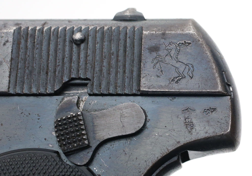 Colt Pocket Hammerless 1903 .32 ACP serial number 378068 (ca. 1921) - Left side showing British proof marks, Enfield inspectors mark and Broad Arrow. These Colts bear commercial London proof house marks, an Enfield inspectors mark and the government broad arrow ownership mark. |