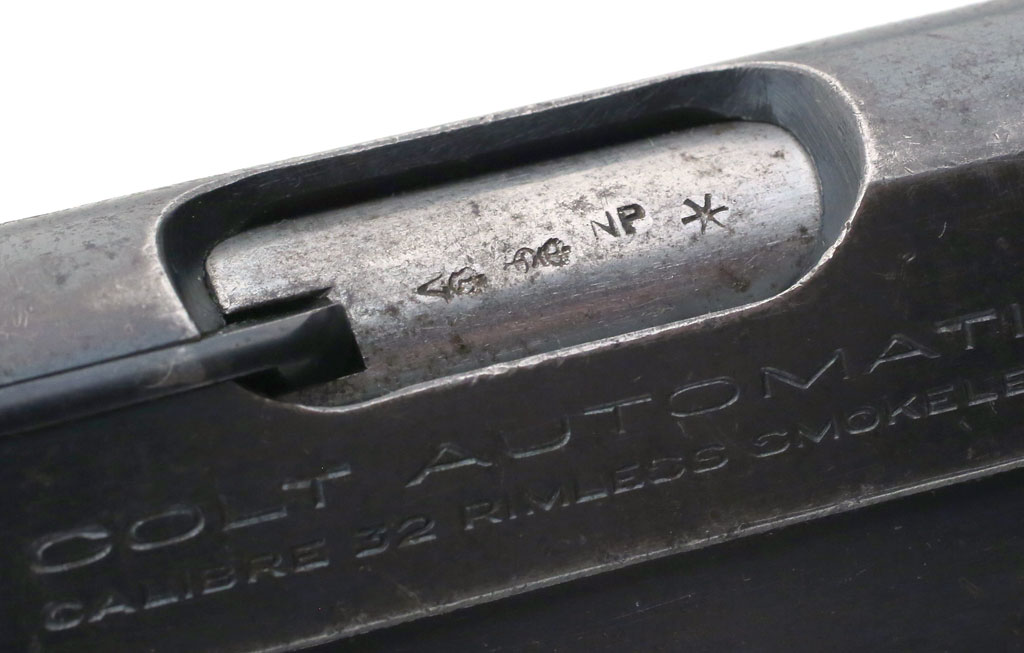 Colt Pocket Hammerless 1903 .32 ACP serial number 378068 (ca. 1921) - close-up of barrel proofs visible through the ejection port.