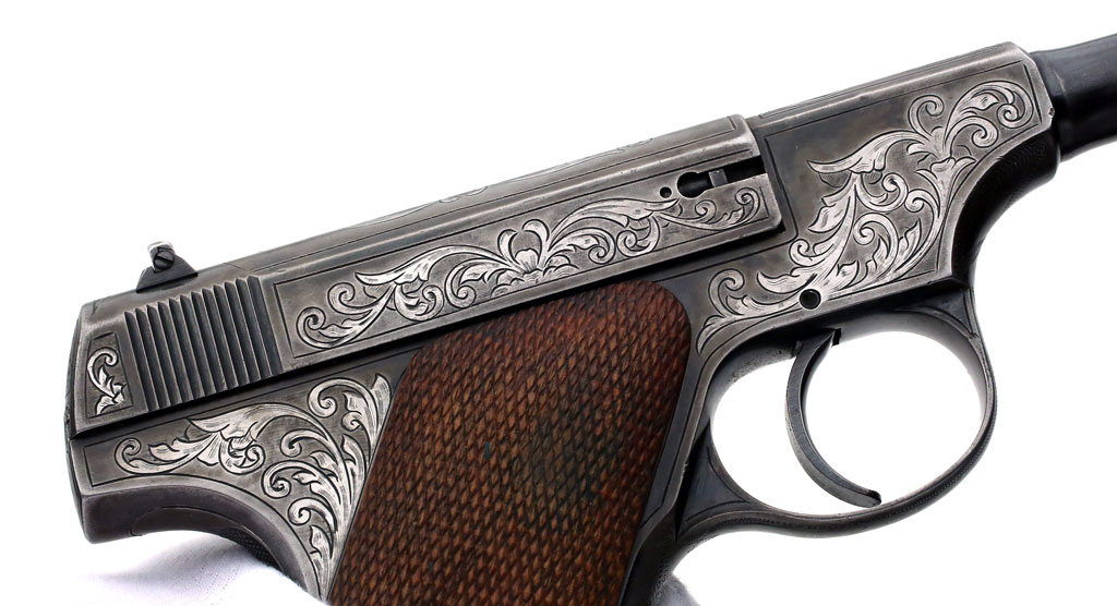 Colt Automatic Target Pistol .22 LR Serial Number 17570 - Left side close-up of engraving and inlay showing Gough's unique style.