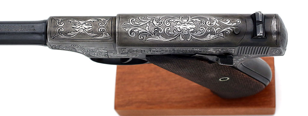Colt Automatic Target Pistol .22 LR Serial Number 17570 - top of slide and frame showing intricate factory engraving and silver inlay.