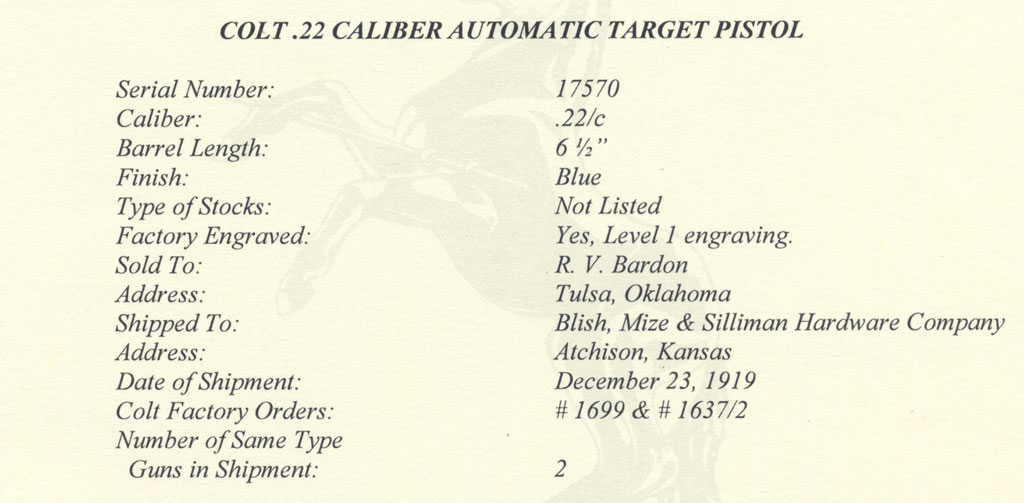 Colt Automatic Target Pistol .22 LR Serial Number 17570 - An early Model S "Pre-Woodsman" factory engraved and silver inlaid by Colt Master Engraver William H. Gough. This pistol was shipped on December 23, 1919 to Blish, Mize, Silliman Hardware Company in Atchison, Kansas and sold to R.V. Bardon in Tulsa, Oklahoma. One of two guns in the shipment. Note the two factory order numbers.